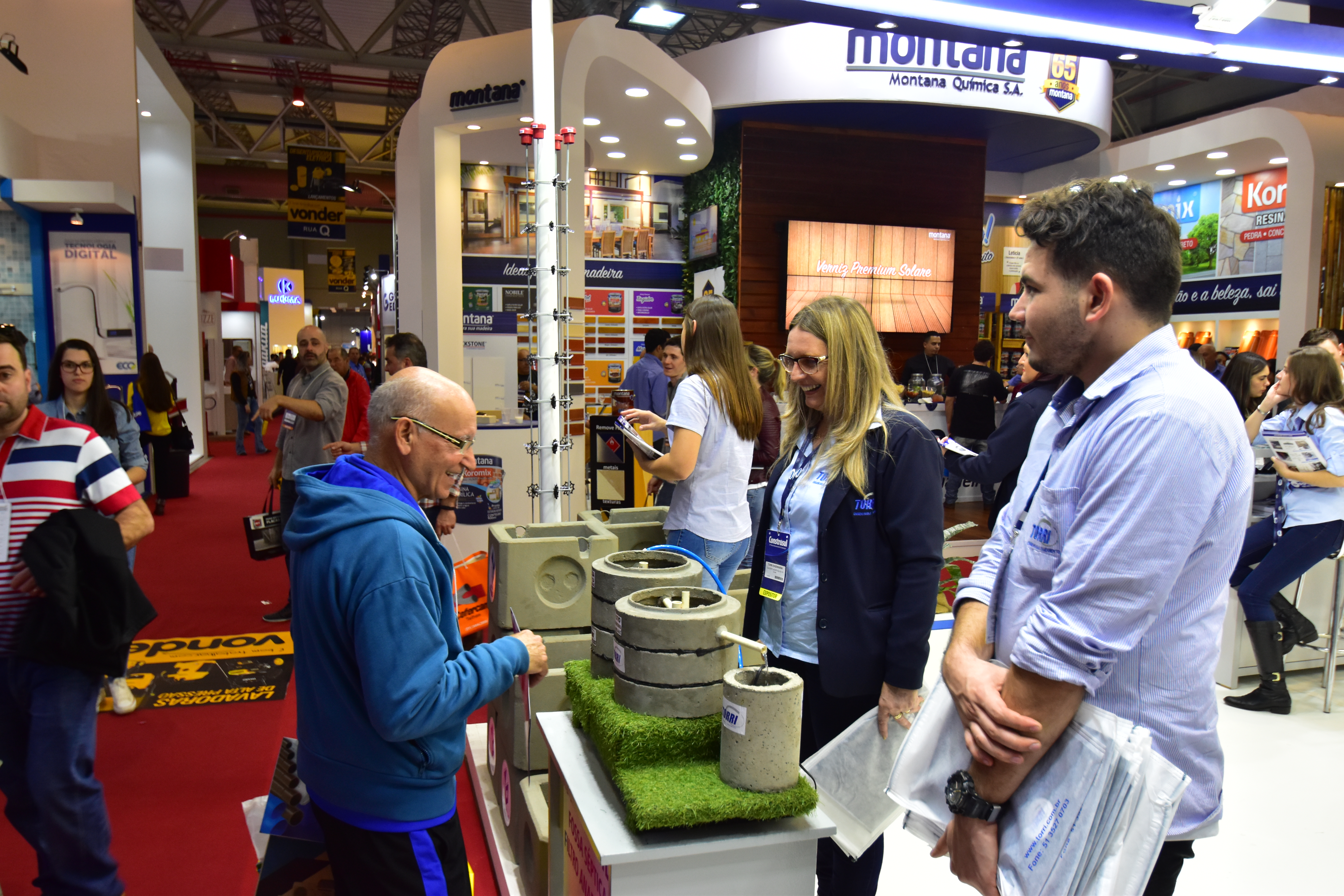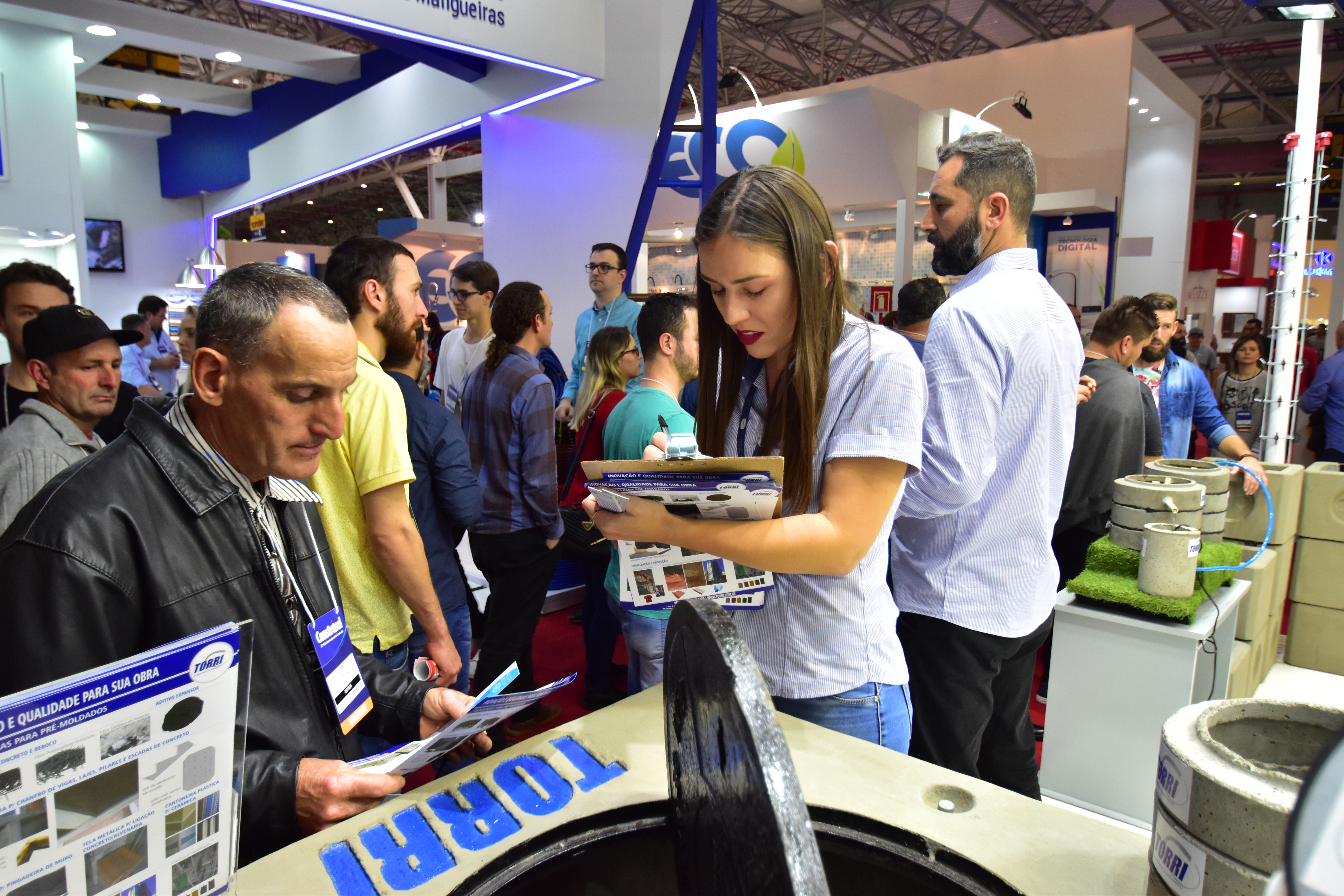 Na estande da TORRI os visitantes viram os diversos modelos de espaçadores plásticos que a TORRI possui, e a miniatura da demonstração do sistema de saneamento (fossa, filtro e cisterna) através do sistema ANELFÁCIL TORRI.: