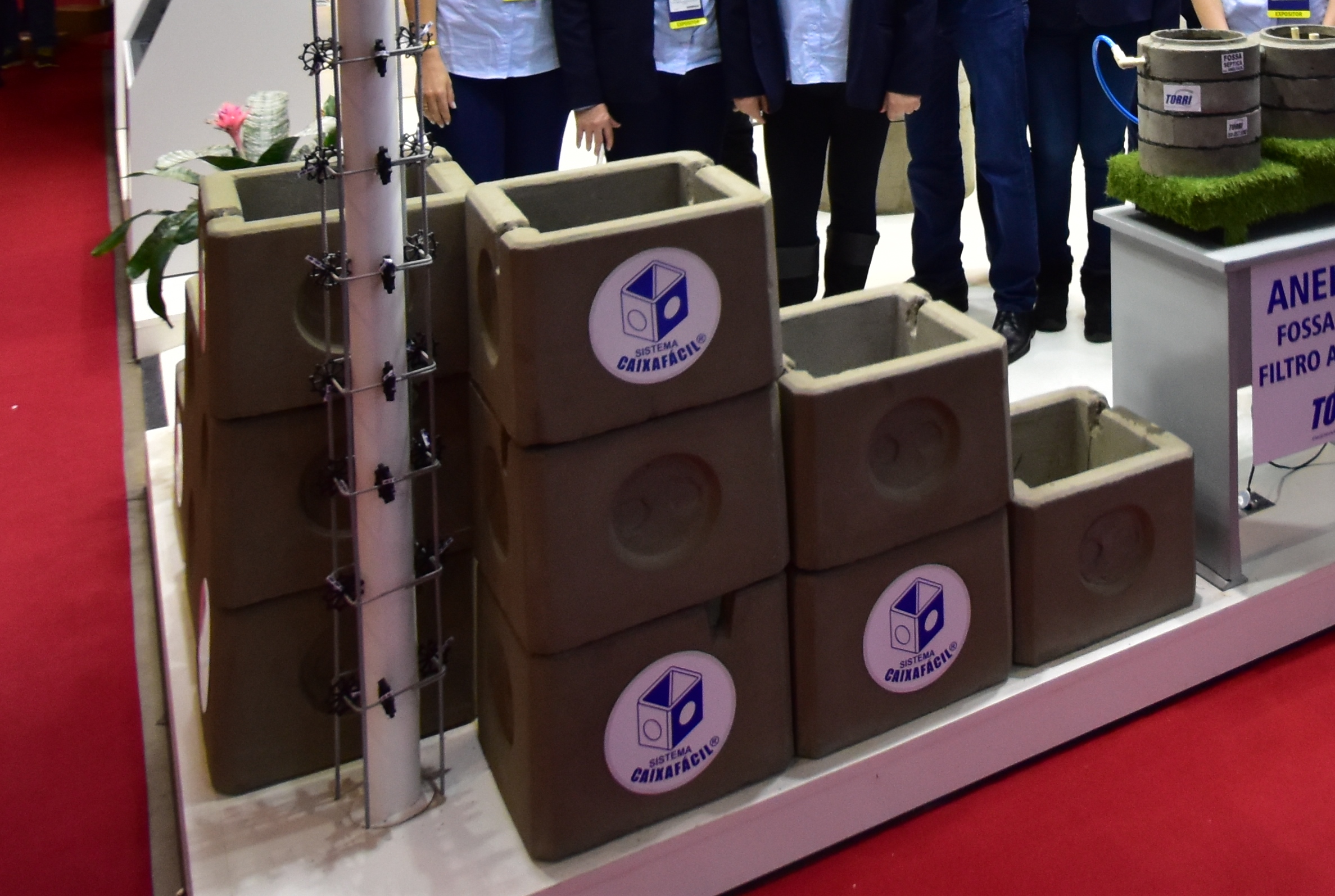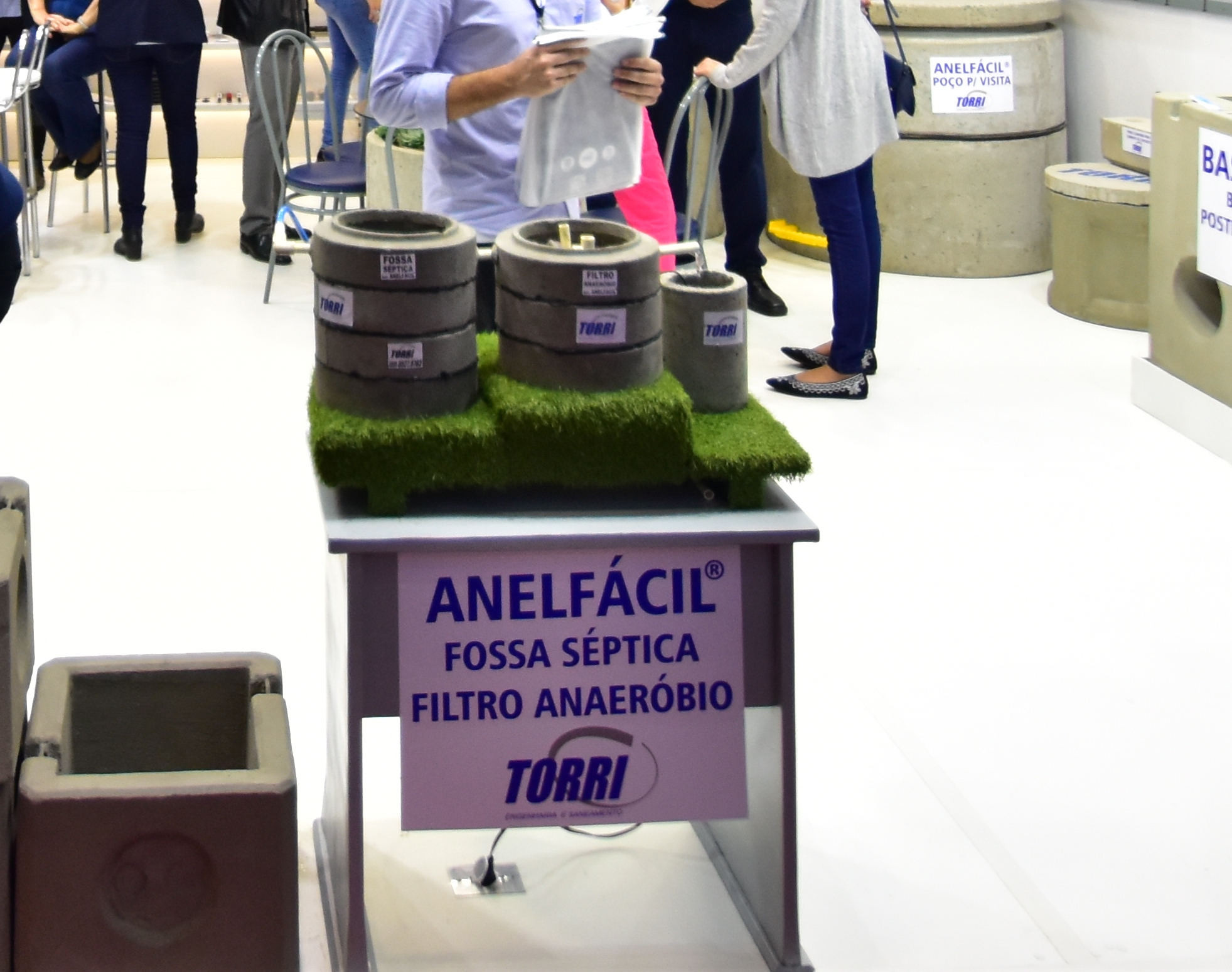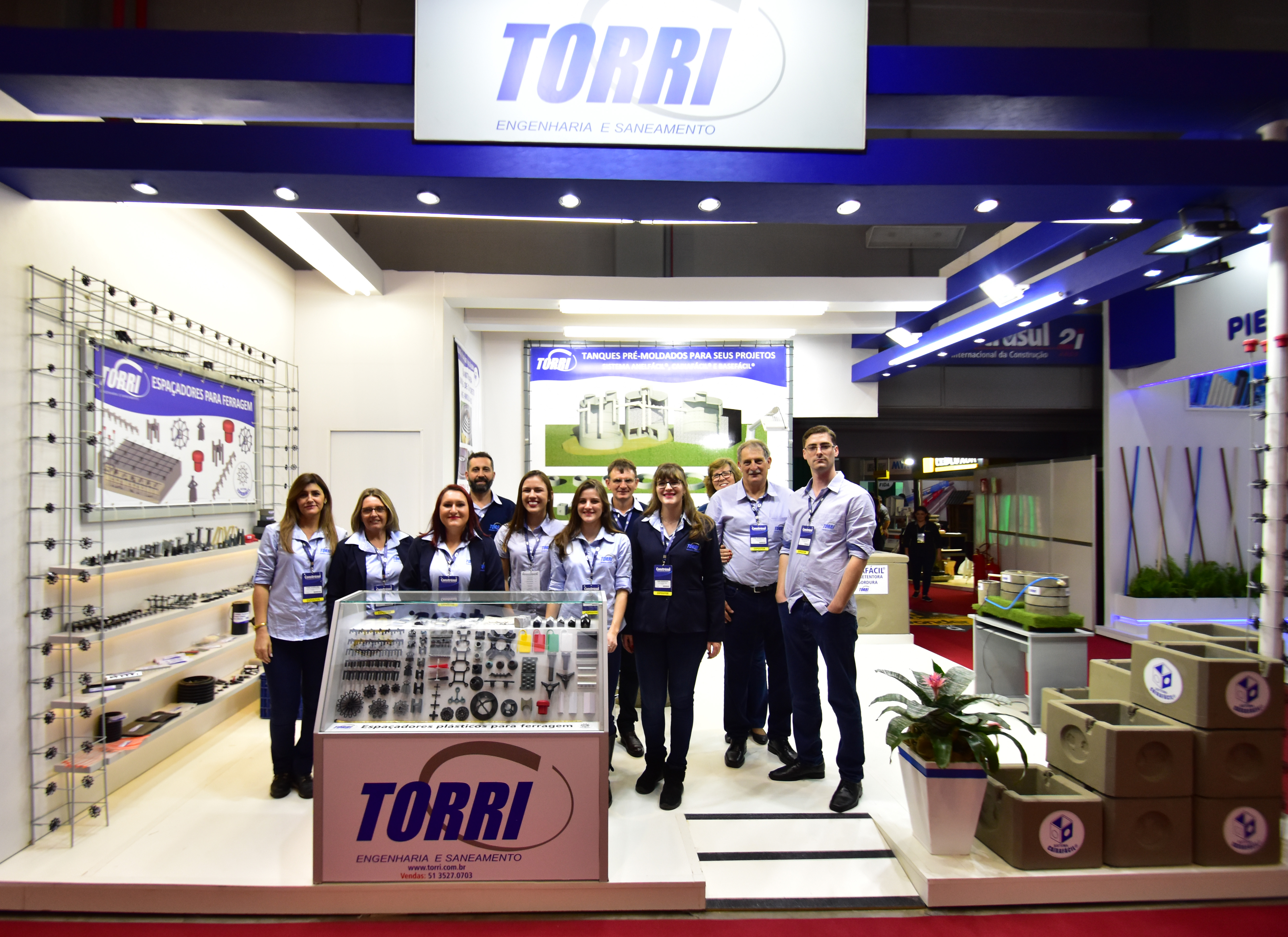 Na estande da TORRI os visitantes viram os diversos modelos de espaçadores plásticos que a TORRI possui, e a miniatura da demonstração do sistema de saneamento (fossa, filtro e cisterna) através do sistema ANELFÁCIL TORRI.: